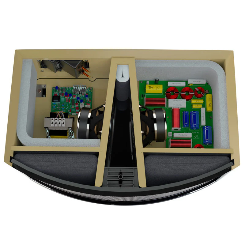 Instead of taking up space by positioning the woofers on each side of the electrostatic panel, they’ve designed a central slot inside the cabinet for the woofers. Now, the dual woofers reside in a well-braced enclosure located behind the tweeter and electrostatic panel.