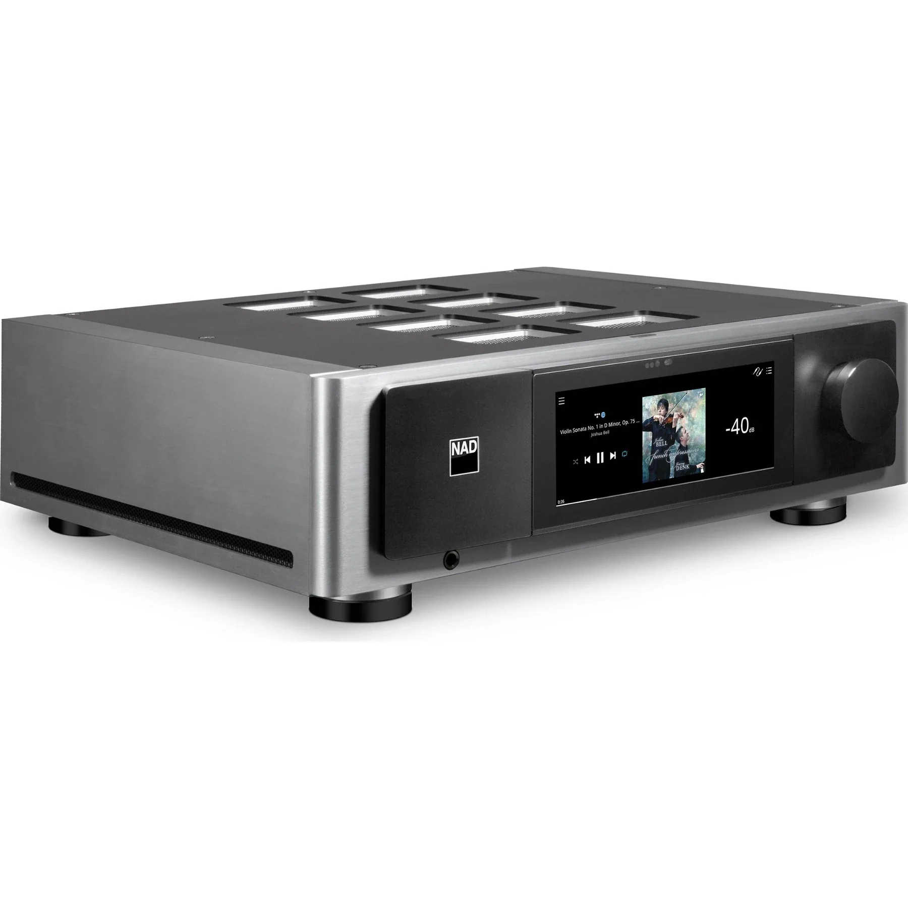 - BluOS network streamer provides access to over 20 streaming services, including several that deliver lossless and high-resolution audio
